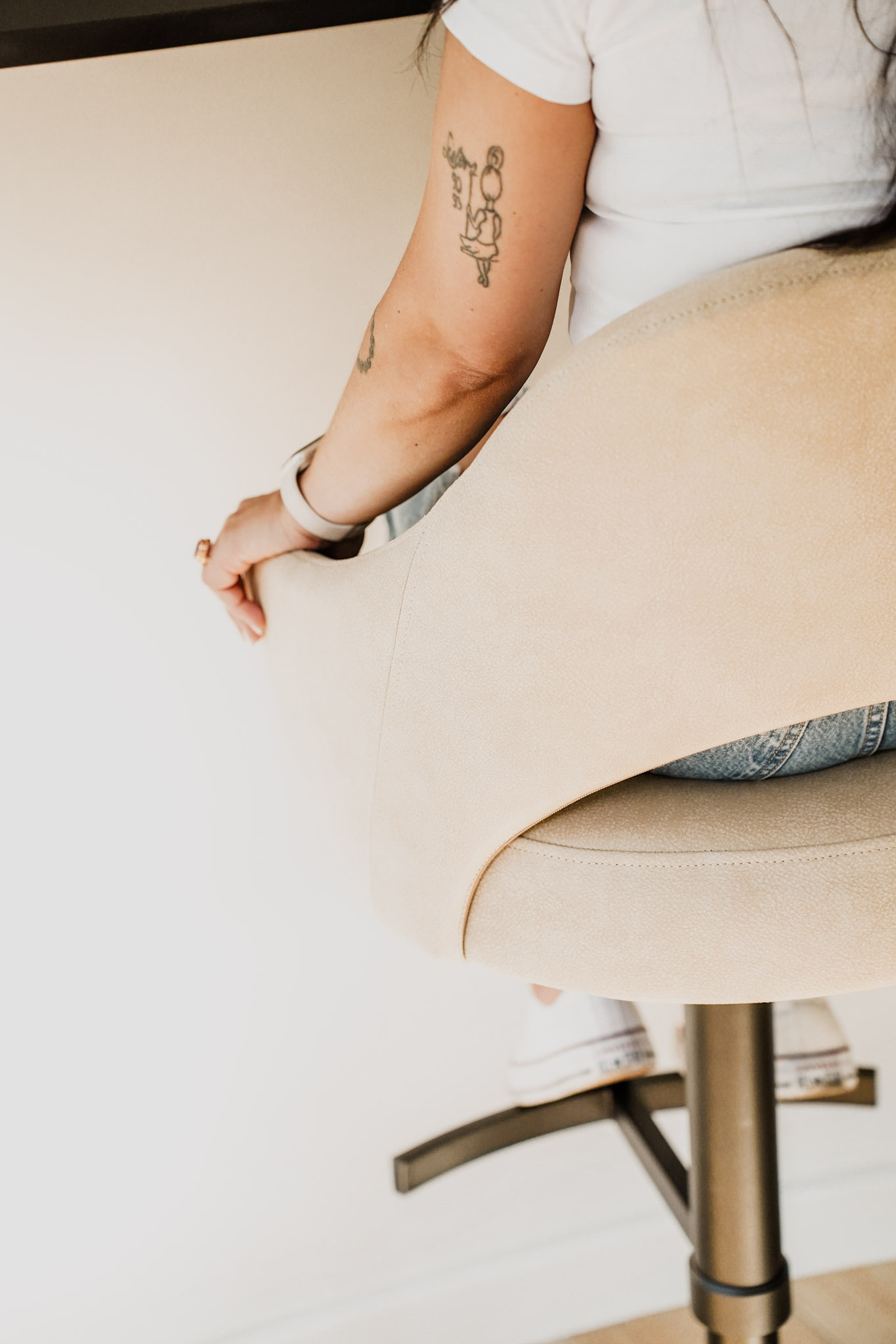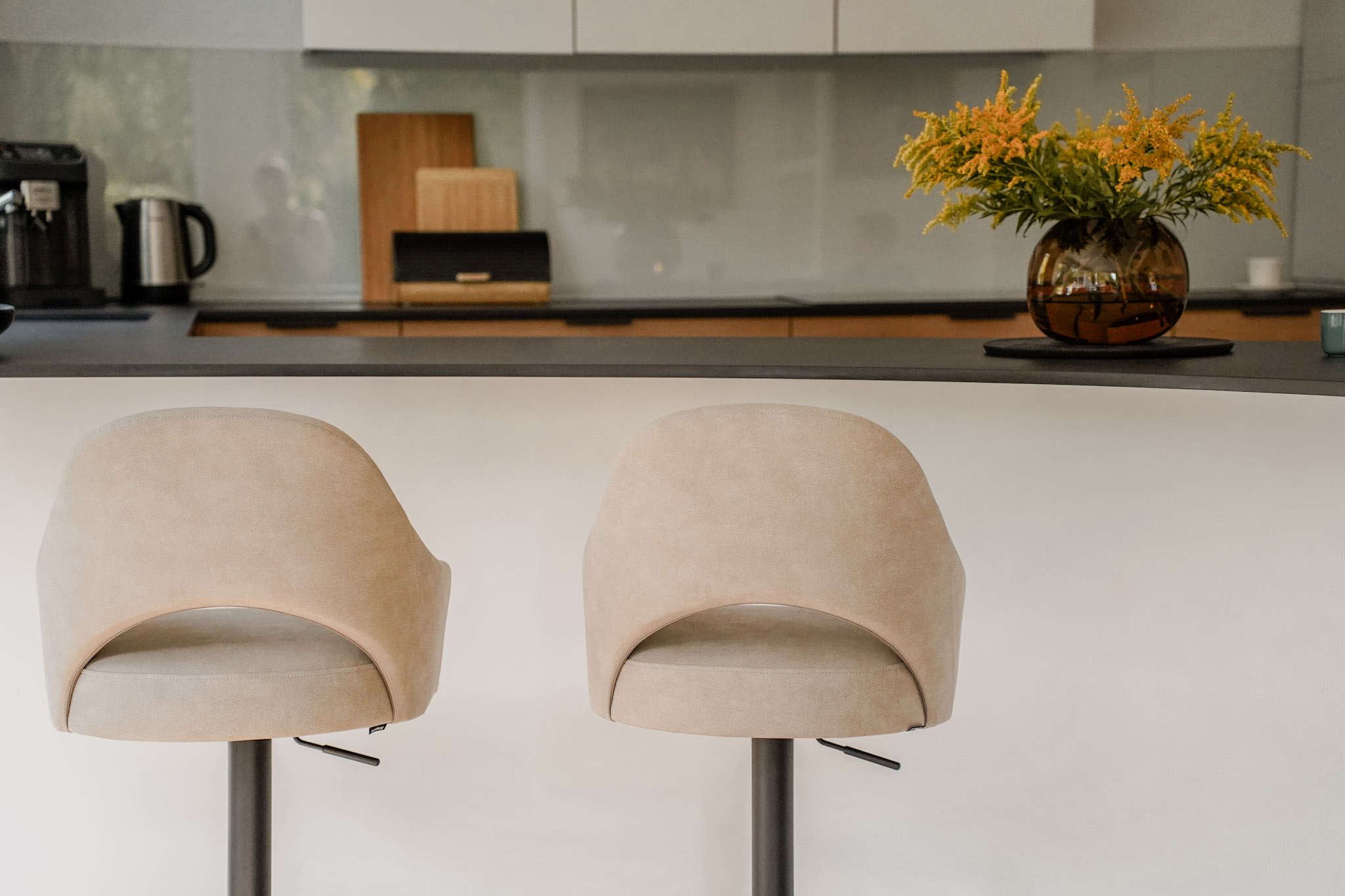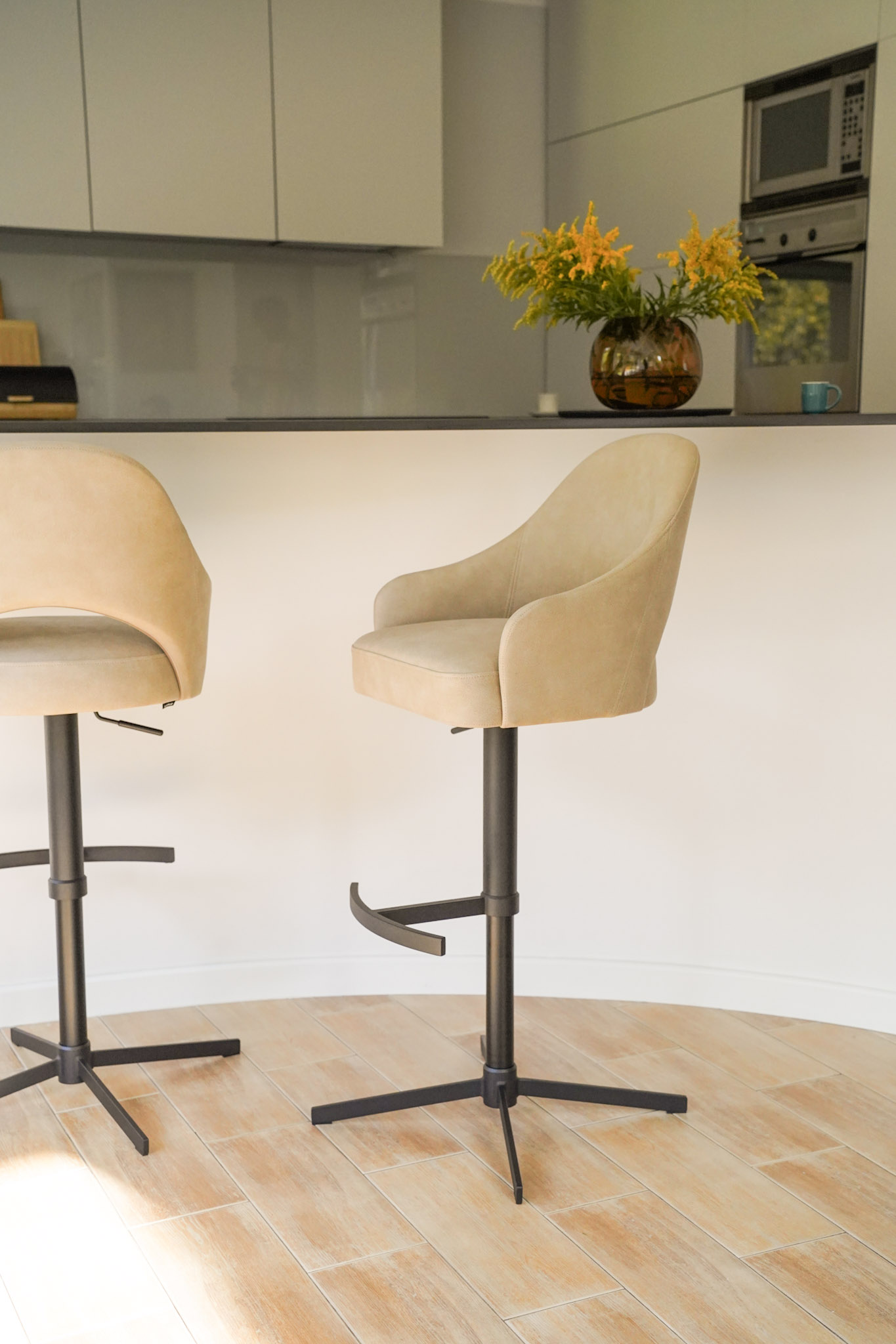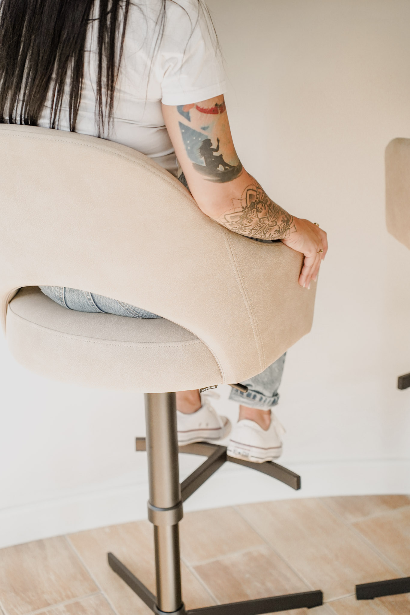 Metalowa noga z regulowaną wysokością i charakterystycznym krzyżowym stelażem w podstawie zapewnia stabilność, wygodę użytkowania oraz swobodę ruchu. Subtelne detale oraz możliwość personalizacji tapicerki i koloru podstawy pozwalają dopasować hoker do każdej aranżacji. Model doskonale sprawdzi się w kuchni, jadalni lub przy wyspie barowej, łącząc elegancję z funkcjonalnością.