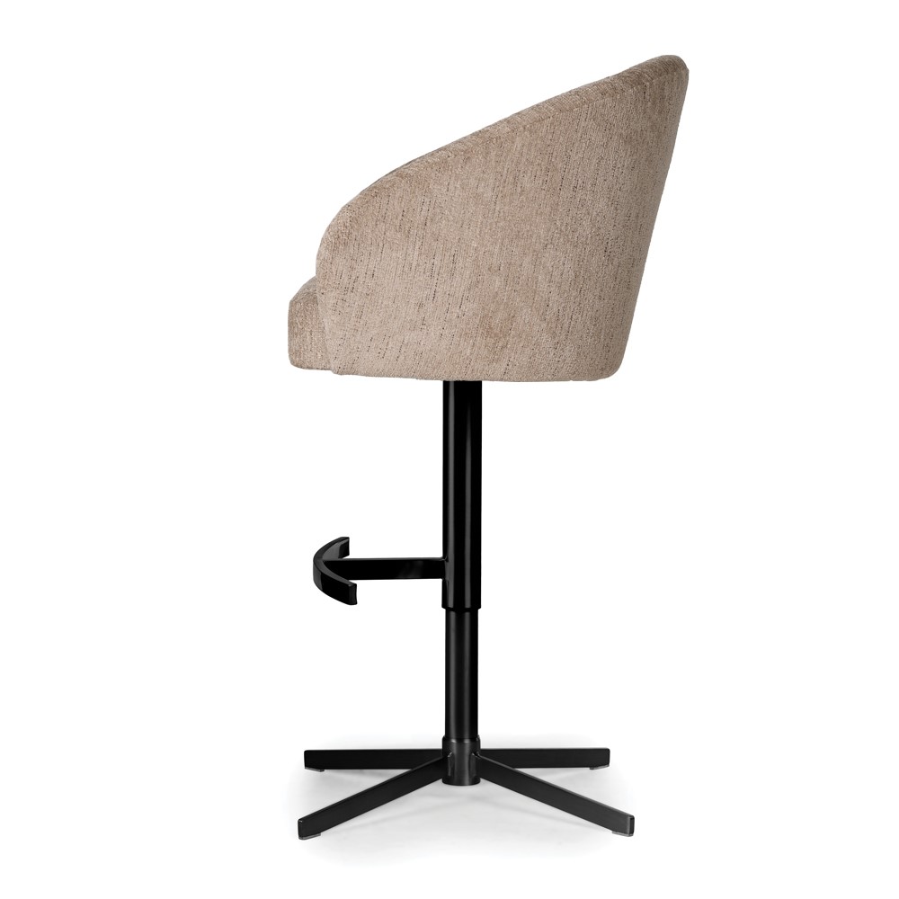 Obrotowa, metalowa noga z regulacją wysokości oraz krzyżową podstawą gwarantuje stabilność i swobodę ruchu, a praktyczny podnóżek zwiększa komfort użytkowania. Model doskonale sprawdzi się przy wyspie kuchennej lub w strefie barowej. Możliwość personalizacji tkaniny oraz koloru podstawy pozwala dopasować hoker do aranżacji wnętrza.