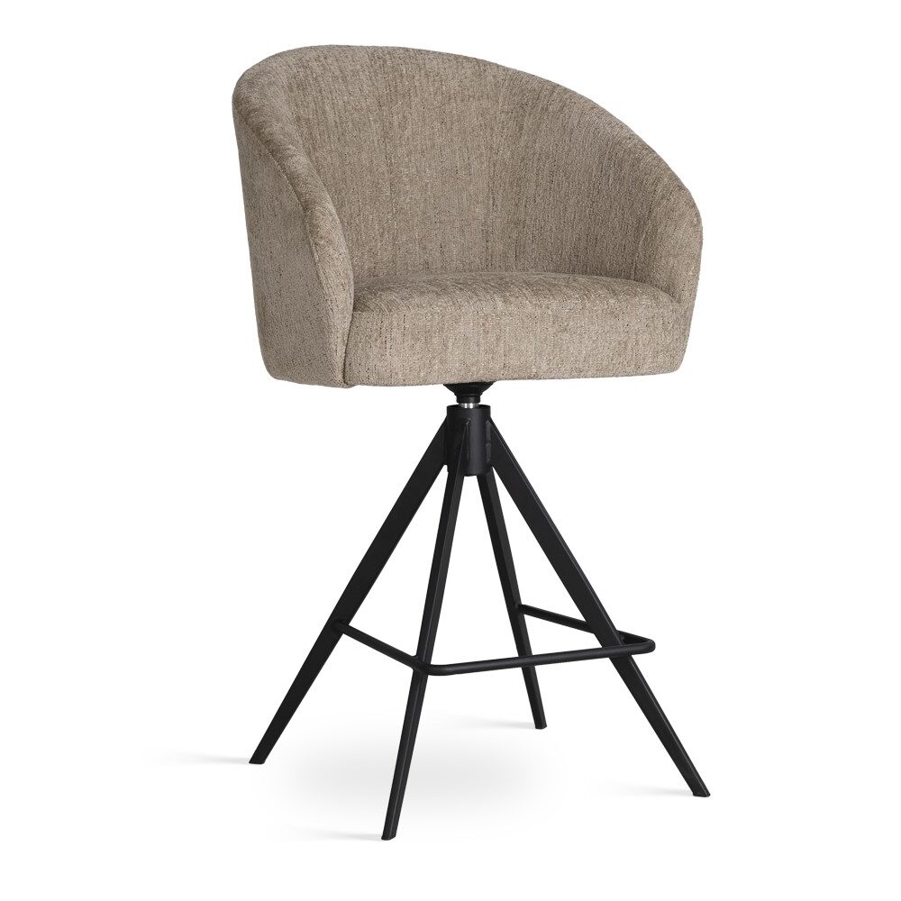 Obrotowa, metalowa noga w kształcie piramidki nadaje całości nowoczesnego charakteru oraz zapewnia stabilność i swobodę ruchu. Model doskonale sprawdzi się przy wyspie kuchennej lub wysokim blacie. Możliwość personalizacji tkaniny oraz koloru podstawy pozwala dopasować hoker do aranżacji wnętrza.