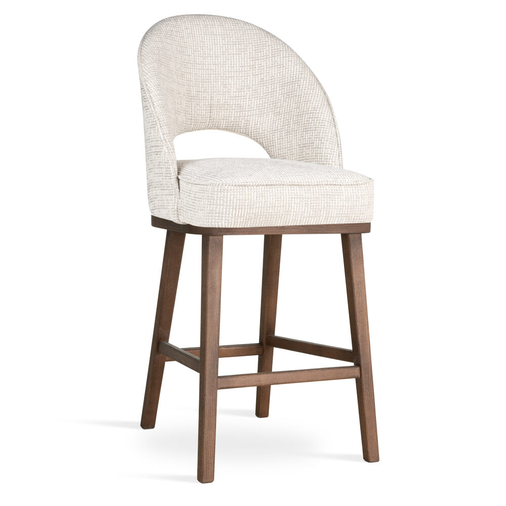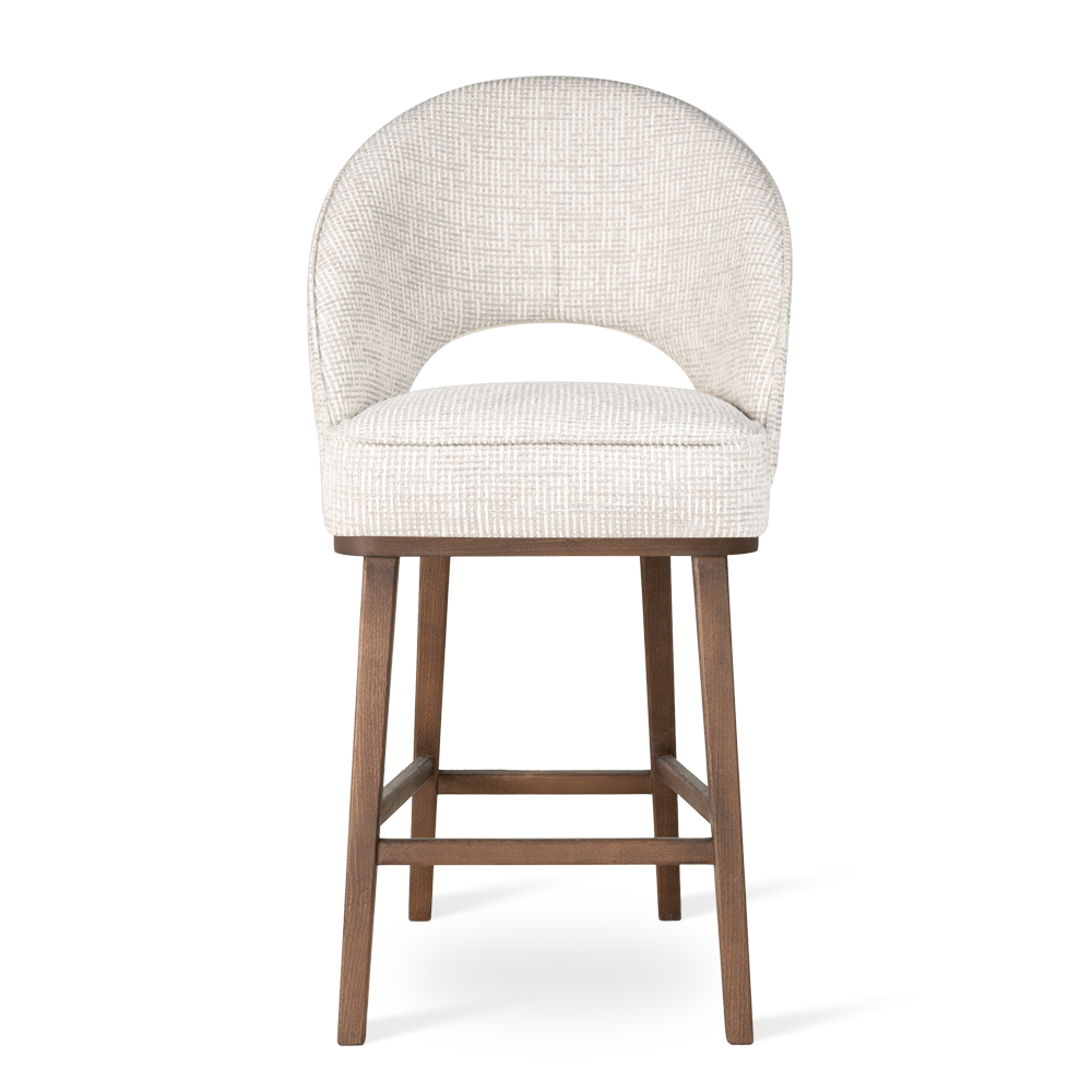 Subtelne wycięcie w oparciu nadaje bryle lekko dekoracyjny akcent, a możliwość personalizacji tkaniny oraz koloru nóg pozwala dopasować hoker tapicerowany do spójnej aranżacji kuchni, jadalni lub przestrzeni przy wyspie barowej.