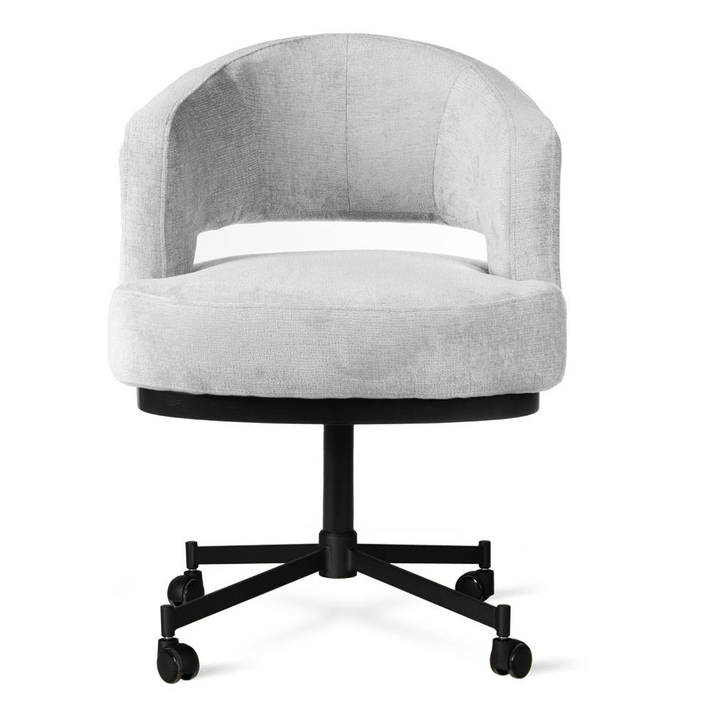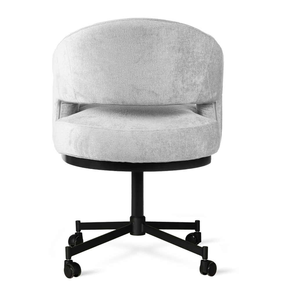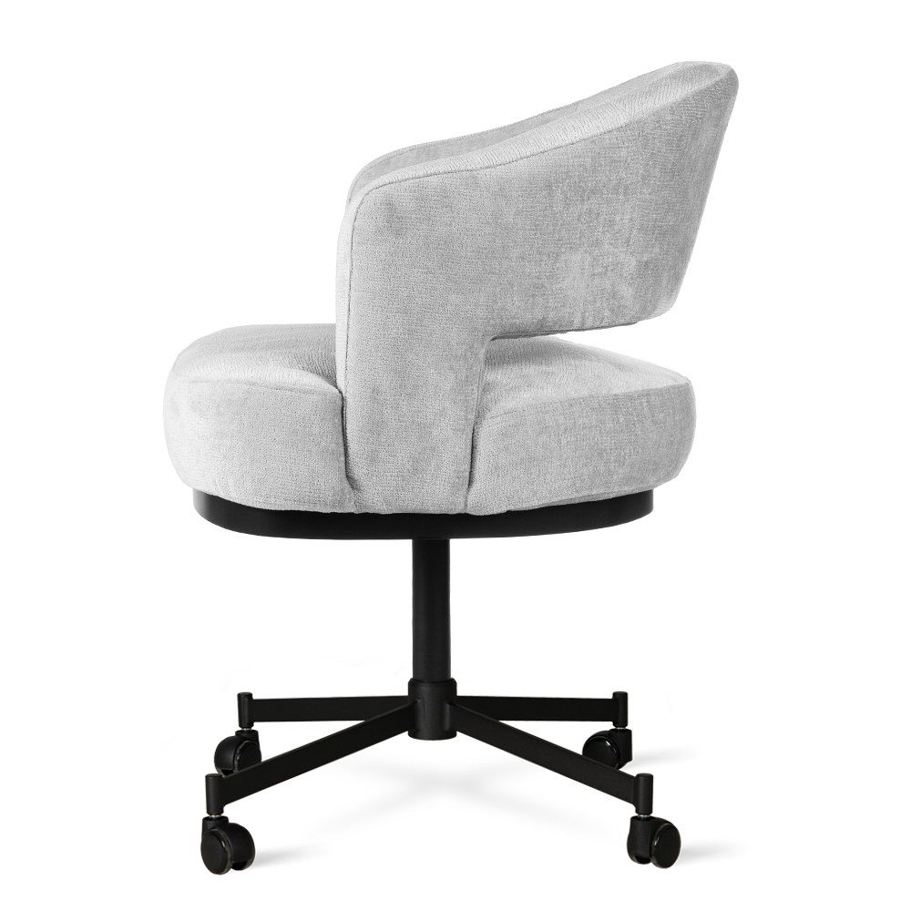 Zaokrąglone oparcie zintegrowane z podłokietnikami delikatnie otula plecy, podnosząc ergonomię i komfort siedzenia. Stabilna, metalowa podstawa na kółkach umożliwia swobodne przemieszczanie się, dzięki czemu krzesło świetnie sprawdzi się przy biurku, toaletce lub stole w domowym gabinecie.